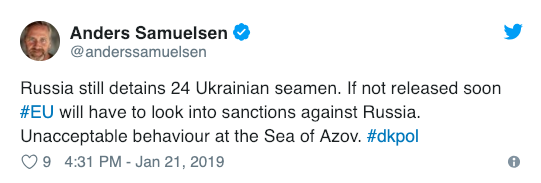 Министр иностранных дел Дании Андерс Самуэльсен заявил, что Европейский Союз может рассмотреть возможность введения ограничительных мер в отношении России за удержание украинских военнопленных моряков, которые были захвачены в результате нападения на украинские корабли в Керченском проливе.