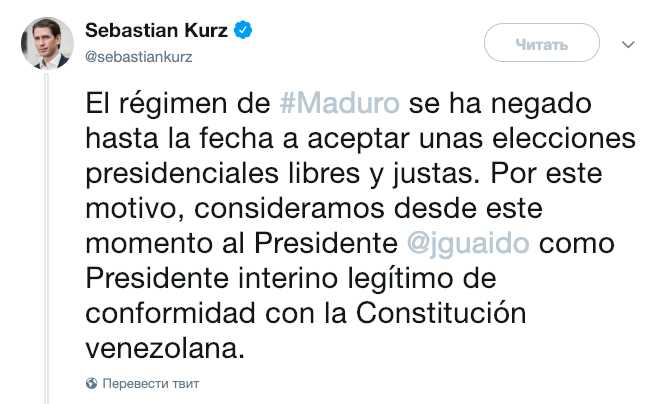 «Режим Мадуро до сих пор отказывался принять свободные и честные президентские выборы. По этой причине мы теперь считаем Гуайдо законным временным президентом в соответствии с Конституцией Венесуэлы», — заявил премьер-министр Австрии Себастьян Курц в Twitter.