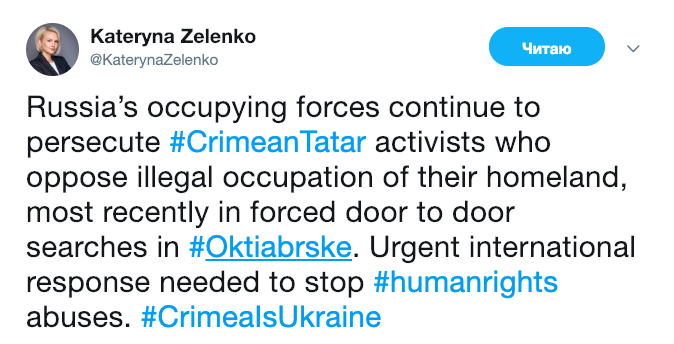 «Российские оккупационные силы продолжают преследовать крымскотатарских активистов, выступающих против незаконной оккупации своей родины. Совсем недавно — принудительные обыски от двери до двери были в Октябрьском. Необходим срочный международный ответ для того, чтобы остановить издевательство над правами человека. Крым — это Украина», — написала Зеленко.