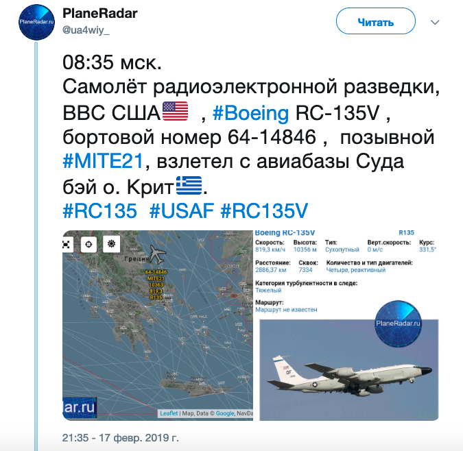 «Самолёт радиоэлектронной разведки ВВС США Boeing RC-135V, бортовой номер 64-14846, позывной #MITE21, взлетел с авиабазы «Суда-Бэй» о. Крит», — говорится в сообщении.