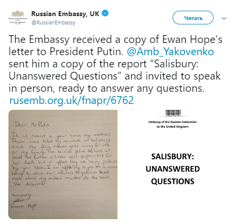 Копию письма в своем Twitter опубликовало посольство РФ в Великобритании.