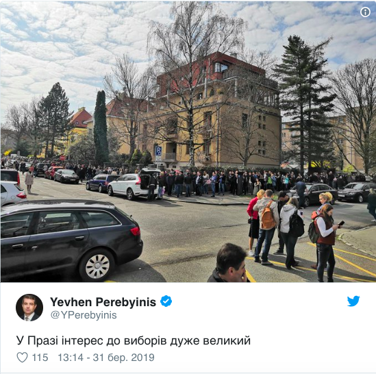 Посол Украины в Чехии Евгений Перебийнис в своем Twitter опубликовал фото очереди, которая растянулась на две улицы.