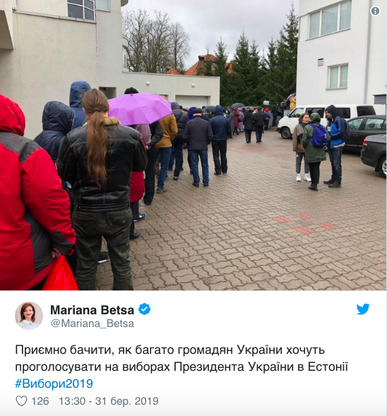 «Приятно видеть, как много граждан Украины хотят проголосовать на выборах президента Украины в Эстонии», — отметила посол Украины в Эстонии Марьяна Беца.