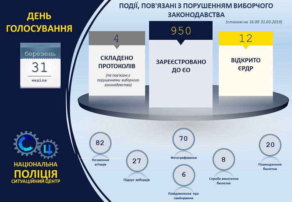 По состоянию на 16:00 в Национальную полицию Украины поступило 950 заявлений и сообщений о правонарушениях в ходе очередных выборов президента страны.