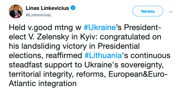 «Провел хорошую встречу с избранным президентом Украины Владимиром Зеленским в Киеве: поздравил с победой на президентских выборах, поддержал неизменную поддержку Литвой суверенитета, территориальной целостности, реформ, европейской и евроатлантической интеграции Украины», — написал Линкявичюс.
