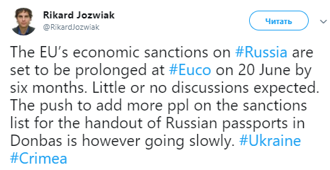«Экономические санкции ЕС в отношении России должны быть продлены Советом ЕС 20 июня на шесть месяцев. <...> Тем не менее, стремление добавить больше людей в санкций список из-за выдачи российских паспортов на Донбассе идет медленно», — написал журналист.
