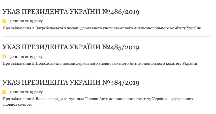 Президент Украины Владимир Зеленский в пятницу, 5 июля, подписал указы об увольнении трех государственных уполномоченных Антимонопольного комитета Украины (АМКУ), в том числе — заместителя главы АМКУ Андрея Вовка.