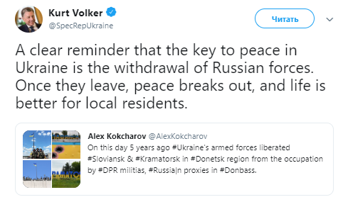 «Четкое напоминание о том, что ключом к миру в Украине является вывод российских войск. Когда они уходят, наступает мир, и жизнь местных жителей становится лучше», — заявил Волкер.