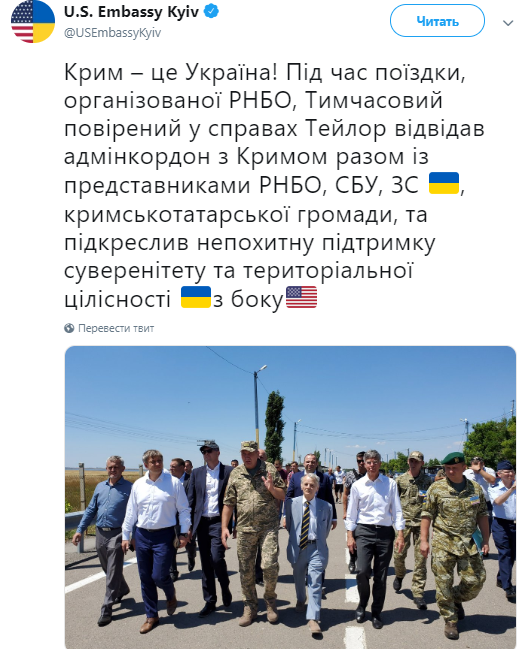 «Крым — это Украина. Во время поездки, организованной СНБО, временный поверенный в делах Тейлор посетил админграницу с Крымом вместе с представителями СНБО, СБУ, ВC Украины, крымскотатарской общины, и подчеркнул непоколебимую поддержку суверенитета и территориальной целостности Украины со стороны США», — говорится в заявлении.