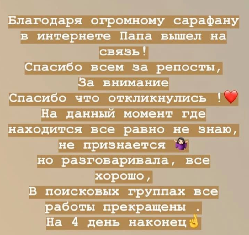 «Благодаря огромному «сарафану» в интернете папа вышел на связь. Спасибо всем за репосты, за внимание», — отметила она.