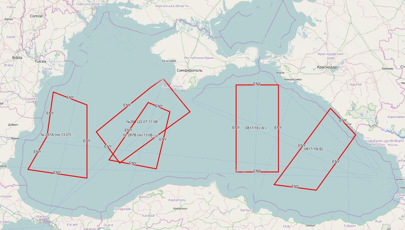Российская Федерация с 24 июля до 19 августа перекрыла пять районов Черного моря, суммарная площадь которых составляет 118 тысяч 570 квадратных километров, что составляет более четверти его общей площади.