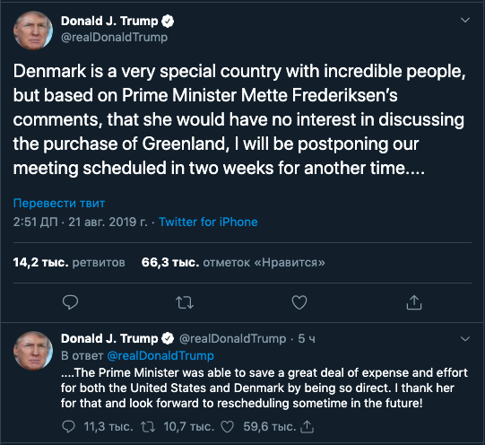 «Дания — очень особенная страна с невероятными людьми, но, основываясь на комментариях премьер-министра Метте Фредериксен, что ей не интересно обсуждать покупку Гренландии, я отложу нашу встречу, запланированную через две недели, на другой раз», — написал Трамп.