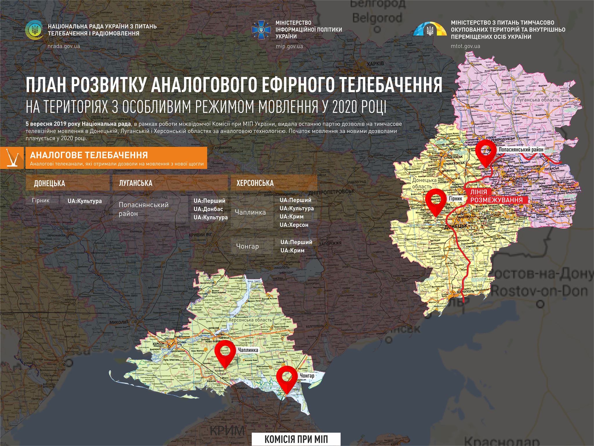 Национальный совет по вопросам телевидения и радиовещания совместно с Министерством информационной политики Украины подготовил план развития аналогового телевидения в Донецкой, Луганской и Херсонской областях в 2020 году.
