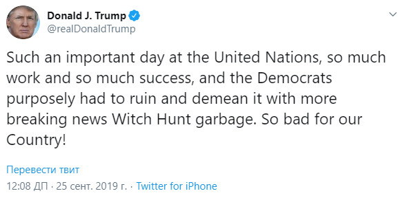 «Такой важный день в Организации Объединенных Наций, столько работы и столько успеха, а демократы намеренно портят и принижают это новостным мусором об охоте на ведьм», — написал президент США.