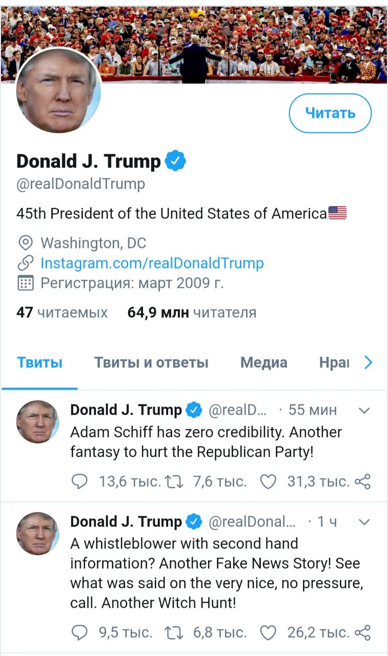 Трамп также написал, что глава комитета по разведке Палаты представителей США Адам Шифф не заслуживает доверия.