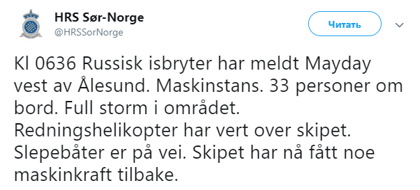 «Российский ледокол подал сигнал бедствия западнее Олесунна», — говорится в сообщении.