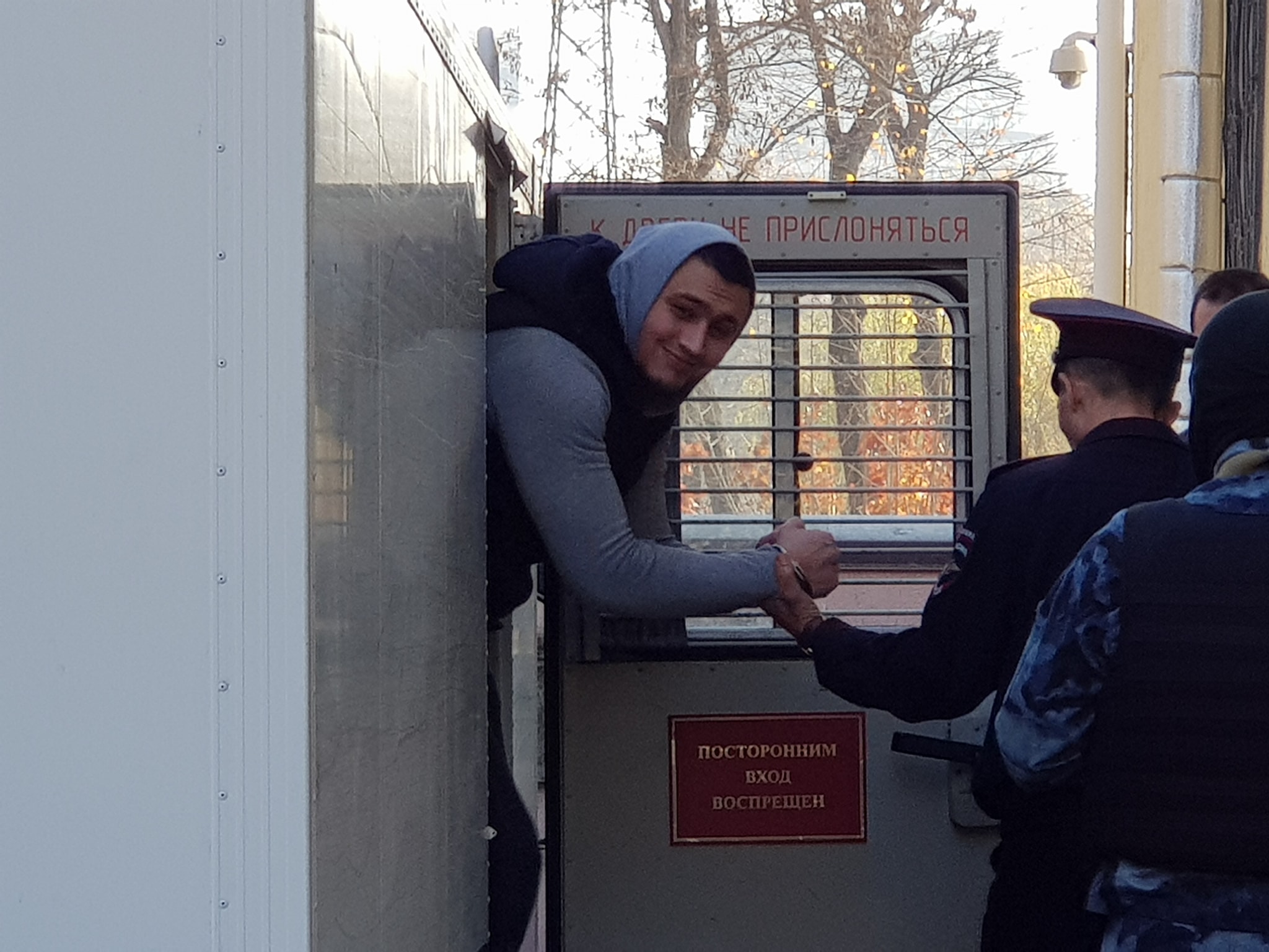 Фигурантов «дела о так называемом терроризме» (вторая симферопольская группа) привезли в зал «суда» в оккупированном Симферополе под сопровождением вооруженных силовиков и «полиции».