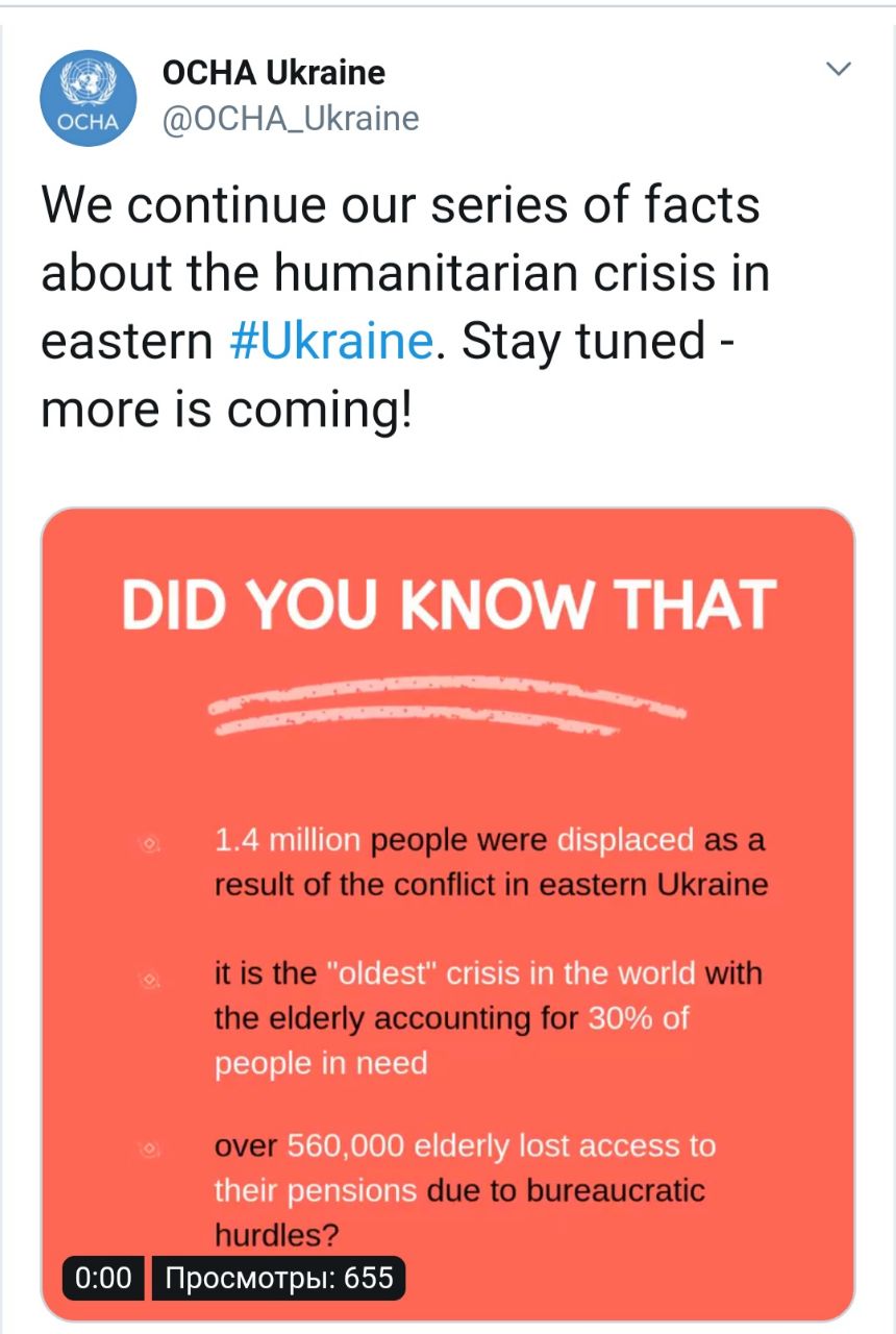 В Организации объединенных наций назвали военный конфликт на Донбассе самым «старым» в мире, потому что 30% из тех, кто нуждаются в помощи из-за него, — пожилые люди.