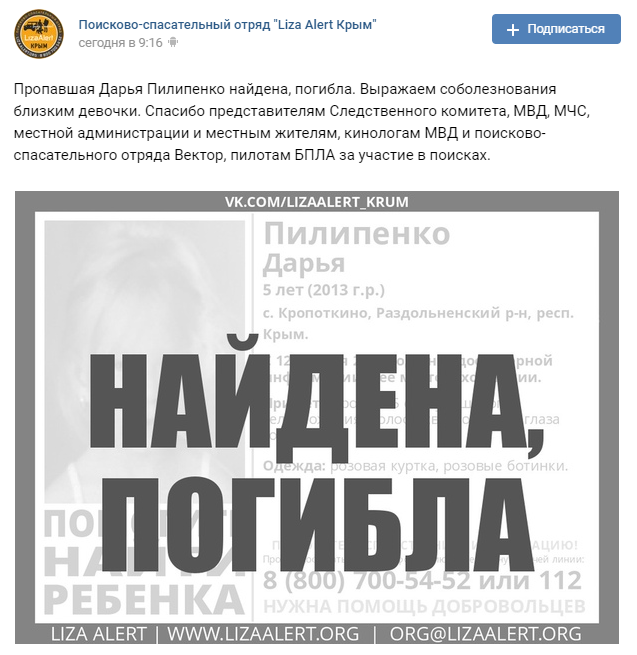 О том, что девочка была найдена мертвой первыми сообщили в добровольческом поисково-спасательном отряде «Liza Alert Крым».