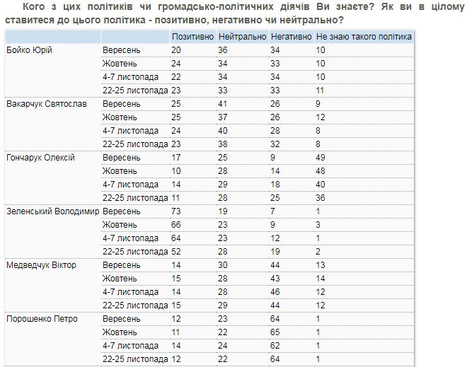 Так, если в начале сентября к Владимиру Зеленскому демонстрировало позитивное отношение 72% опрошенных, в октябре — 66%, в начале ноября — 64%, то в конце ноября — 52%.