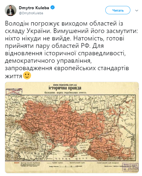 «Володин угрожает выходом областей из состава Украины. Вынужден его огорчить: никто никуда не выйдет. Вместо этого готовы принять пару областей РФ. Для восстановления исторической справедливости, демократического управления, внедрения европейских стандартов жизни», — заявил Кулеба.