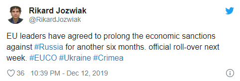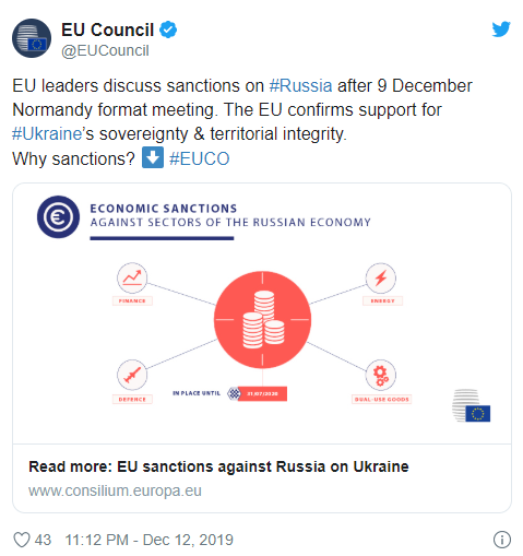Как говорится в официальном сообщении Европейского Совета, лидеры ЕС на встрече в Брюсселе обсудили вопрос санкций против России после саммита «нормандской четверки», который состоялся 9 декабря.