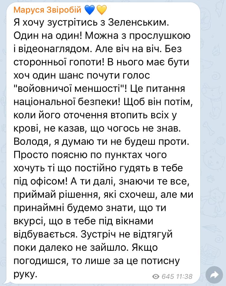 «Я хочу встретиться с Зеленским. Один на один! Можно с прослушкой и видеонаблюдением. Но один на один. Без посторонней гопоты! У него должен быть хоть один шанс услышать голос «воинствующего меньшинства»! Это вопрос национальной безопасности! Чтобы он потом, когда его окружение утопит всех в крови, не говорил, что чего-то не знал. Володя, я думаю ты не будешь против. Просто объясню по пунктам, чего хотят те, кто постоянно гудят у тебя под офисом! А ты дальше, зная все это, принимай решения, какие хочешь, но мы, по крайней мере, будем знать, что ты в курсе, что у тебя под окнами происходит. Встречу не оттягивай, пока далеко не зашло. Если согласишься, то только за это пожму руку», — написала Звиробий.