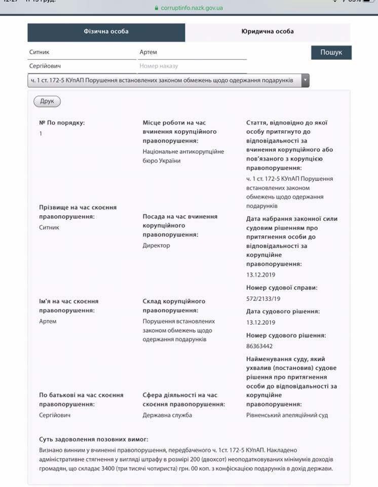 Сытник привлечен к ответственности за совершение коррупционного или связанного с коррупцией правонарушения по ч. 1 ст. 172-5 КУоАП («Нарушение установленных законом ограничений относительно получения подарков»).