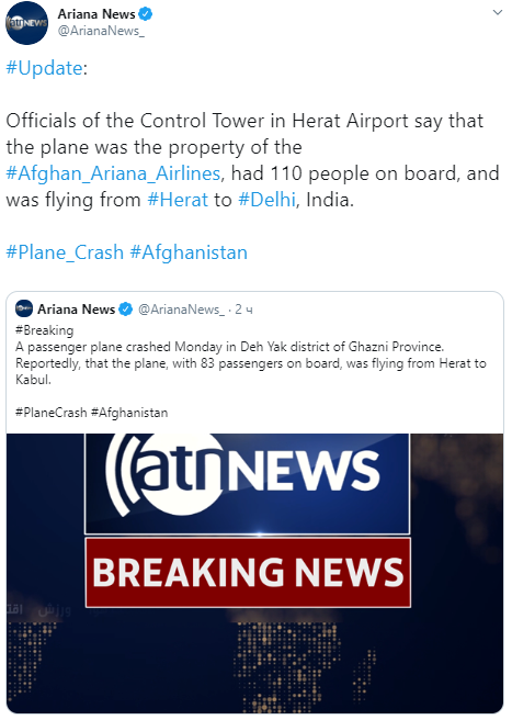 Афганское агентство Ariana News со ссылкой на диспетчеров аэропорта Герата сообщило, что разбившийся самолет направлялся из Герата в Дели, а на борту находились 110 человек.
