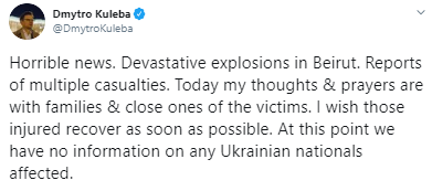 Окрім того, міністр закордонних справ України Дмитро Кулеба  у своєму Twitter написав, що наразі немає інформації про постраждалих громадян України під час вибуху у столиці Лівану.