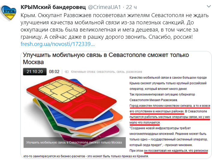 «До окупації зв'язок був чудовий і мегадешевий, в тому числі за кордон. А зараз навіть в «Рашку» дорого дзвонити. Спасибі, Росія!» —  прокоментував ситуацію блогер Кримський бандерівець у Twitter.